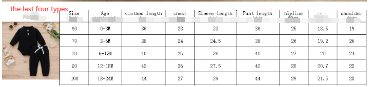 Size(cm)60 Tops Length:35Bust:42Pant Length:35Waist:36 Age:0-3 Months70 Tops Length:37Bust:44Pant Length:38Waist:38 Age:3-6 Months80 Tops Length:39Bust:46Pant Length:41Waist:40 Age:6-12 Months90 Tops Length:41Bust:48Pant Length:43Waist:42 Age:12-18 Months100 Tops Length:43Bust:50Pant Length:45Waist:44 Age:18-24 Months